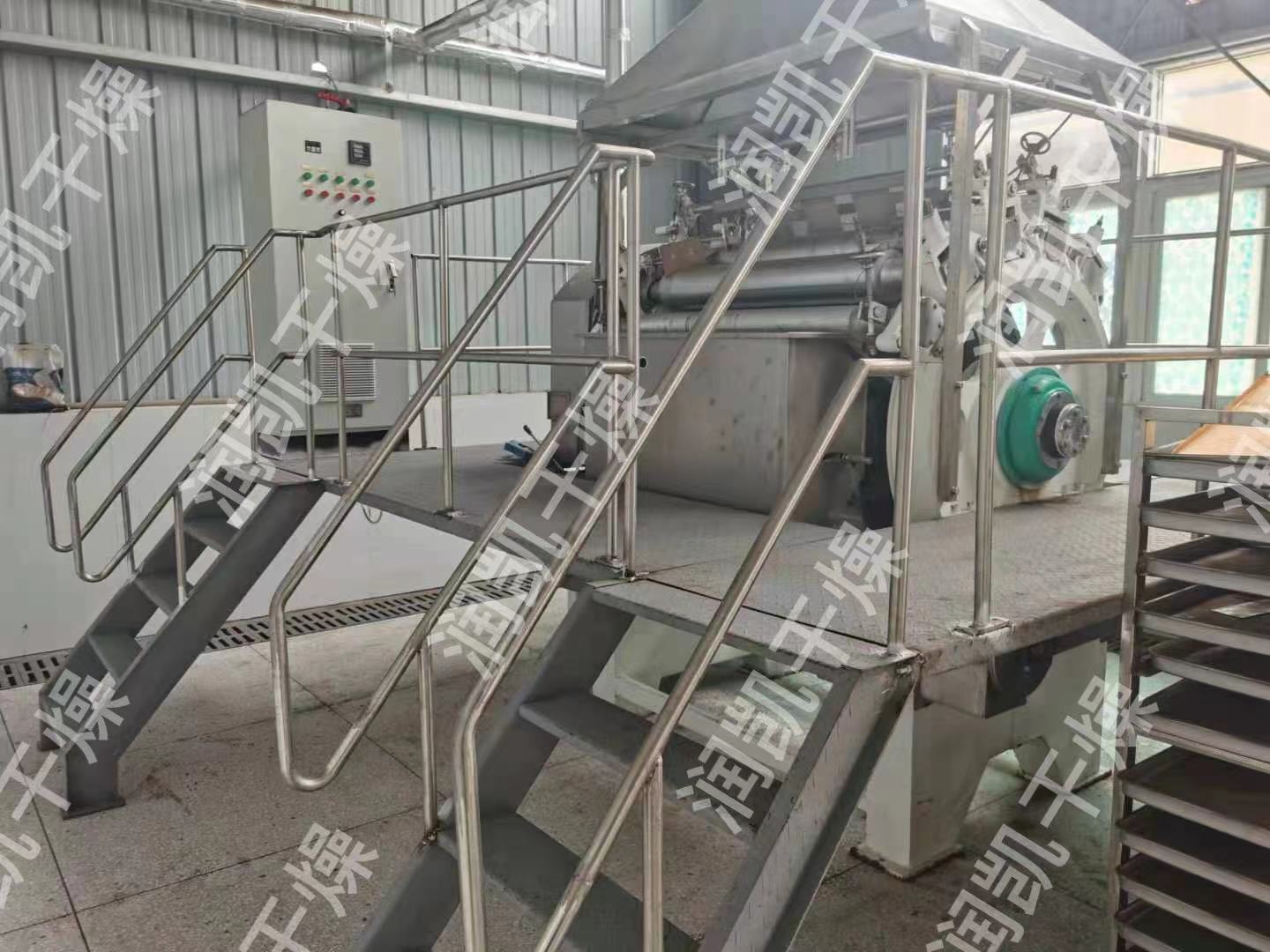 3、啟動(dòng)電機(jī),主滾筒動(dòng)運(yùn)轉(zhuǎn)平穩(wěn),溫度升高后加入物料后調(diào)整電機(jī)轉(zhuǎn)速及物料在滾筒上薄膜均勻程度來(lái)控制物料終含水量。