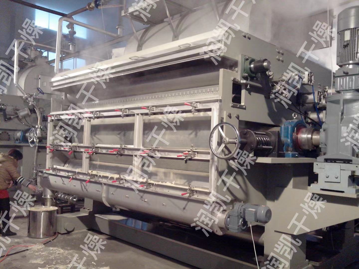 潤(rùn)凱干燥的單滾筒刮板干燥機(jī)主要用于處理液體物料,既可通入蒸汽、熱水或熱油加熱干燥,又可通入冷水冷卻結(jié)片:可根據(jù)不同的物料性質(zhì)和工藝要求采用浸入式、噴淋式、碾輔式等加料方式。
